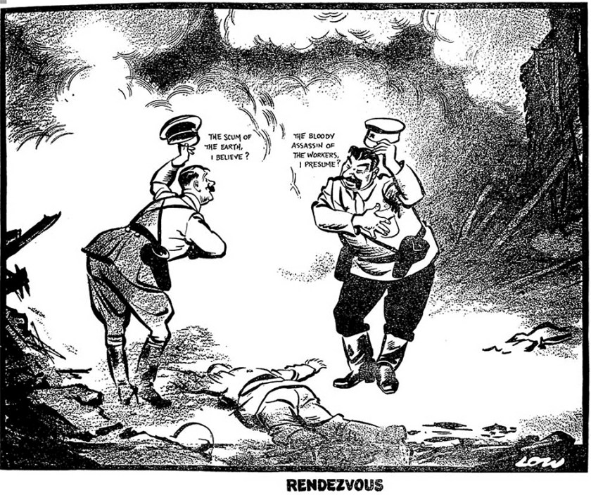 The Molotov-Ribbentrop Pact, signed August 1939 and commented on in these period cartoons, divided up Poland and meddled in the fates of several other small countries. The two agreed to not attack each other nor to ally with the other’s enemies. In short, they were practically allies. All this of course went to hell in the summer of 1941 when Hitler let his racist fanaticism get the better of him and violated the pact by launching the ultimately disastrous invasion of Russia.