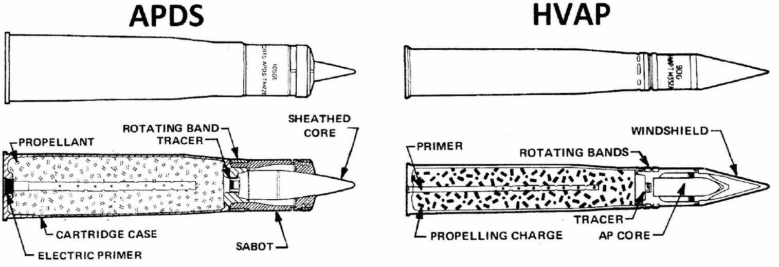 In order to increase velocity further designers developed the high-velocity armor-piercing (HVAP) round by encasing a tungsten carbide sub-caliber penetrator within a larger, duraluminum projectile.  Having lighter weight and greater speed the outer shell upon impact peeled away “and the projectile’s energy was concentrated on a smaller impact point of the hard metal penetrator.”[11]  Two disadvantages with this round was one, the lighter round had poor long-range performance and two, and tungsten carbide was a badly needed, precious commodity for industrial tools during the war.