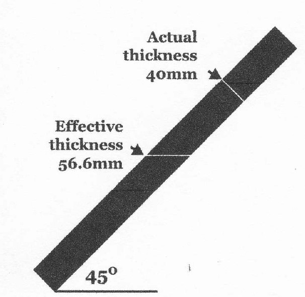 These results influenced designers to increase the armor thickness of their tanks.  Since it would make a tank to heavy and impractical, designers had to determine which surface to increase the thickness of the armor.  This was determined to be “the front of the turret and glacis plate on the front of the hull usually have the thickest armor, the hull and turret sides less armor, and the tank roof and belly the least armor.”[5]  Armor thickness can be improved by increasing the angle of the armor plate in relation to the enemy weapon.  “In the case of a tank with 20 mm armor, the vertical plate has an effective thickness of 20 mm.  When angled 30 degrees, the effective thickness increases to 22 mm, and when angles to 45 degrees its effective thickness is 28mm.”[6] Armor quality is determined by that particular country’s manufacturing techniques, variation in the hardness, and supply of critical alloys.